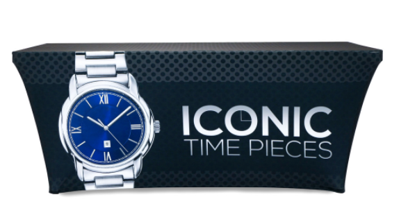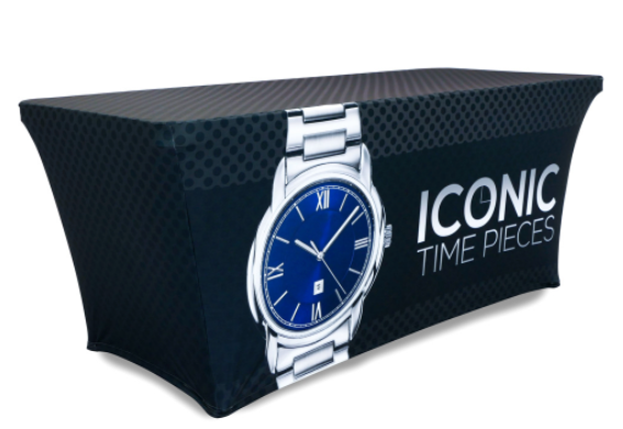 Our Stretch Table Throws fit tapered and taut around the table and secures under its legs.